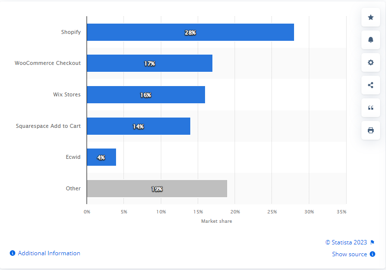 Powering over a million businesses in 175+ countries, Shopify opens success doors for businesses. As per recent statistics, in June 2023, Shopify was the biggest name in the US eCommerce market as it gained a market share of 28%- the highest compared to other eCommerce software platforms.