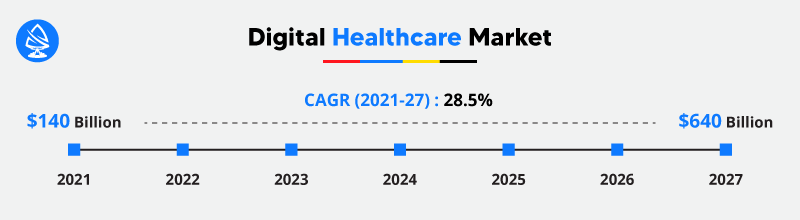 In 2020, the global digital healthcare market was valued at approximately USD 140 Billion. It is expected to grow at a CAGR of 28.5 percent from 2021 to 2027. The global healthcare market is expected to reach USD 640 Billion by the end of 2027.