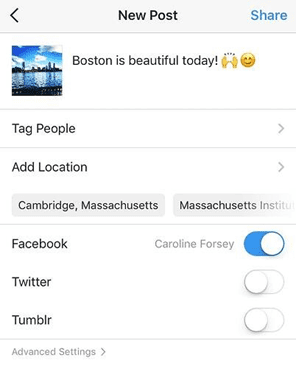 Now, you can add captions and tag people here in this step. You can also post the image or video to your linked account, such as Facebook. Finally, click on “Share” in the top-right corner to post the image or video.
