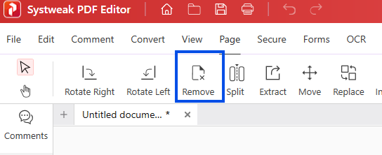 - Click on Remove from the tab, or place the cursor on the page and click on the remove icon.