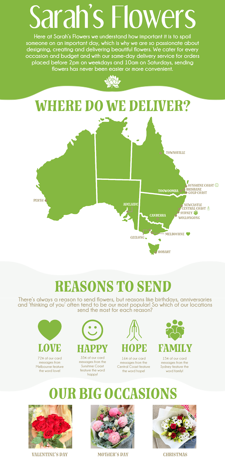 Sarah�s flower shop offers quality flowers to best suit your needs. They offer flower delivery Adelaide and nationwide. Sarah�s flower specializes in flowers for different occasions, like birthdays or anniversaries. Their biggest priority is 100% guaranteed customer satisfaction. They offer delivery options from Monday to Saturday for as low as $18.95 for next-day delivery. Their best-selling addon for flowers is the famous Get Well Balloon.
