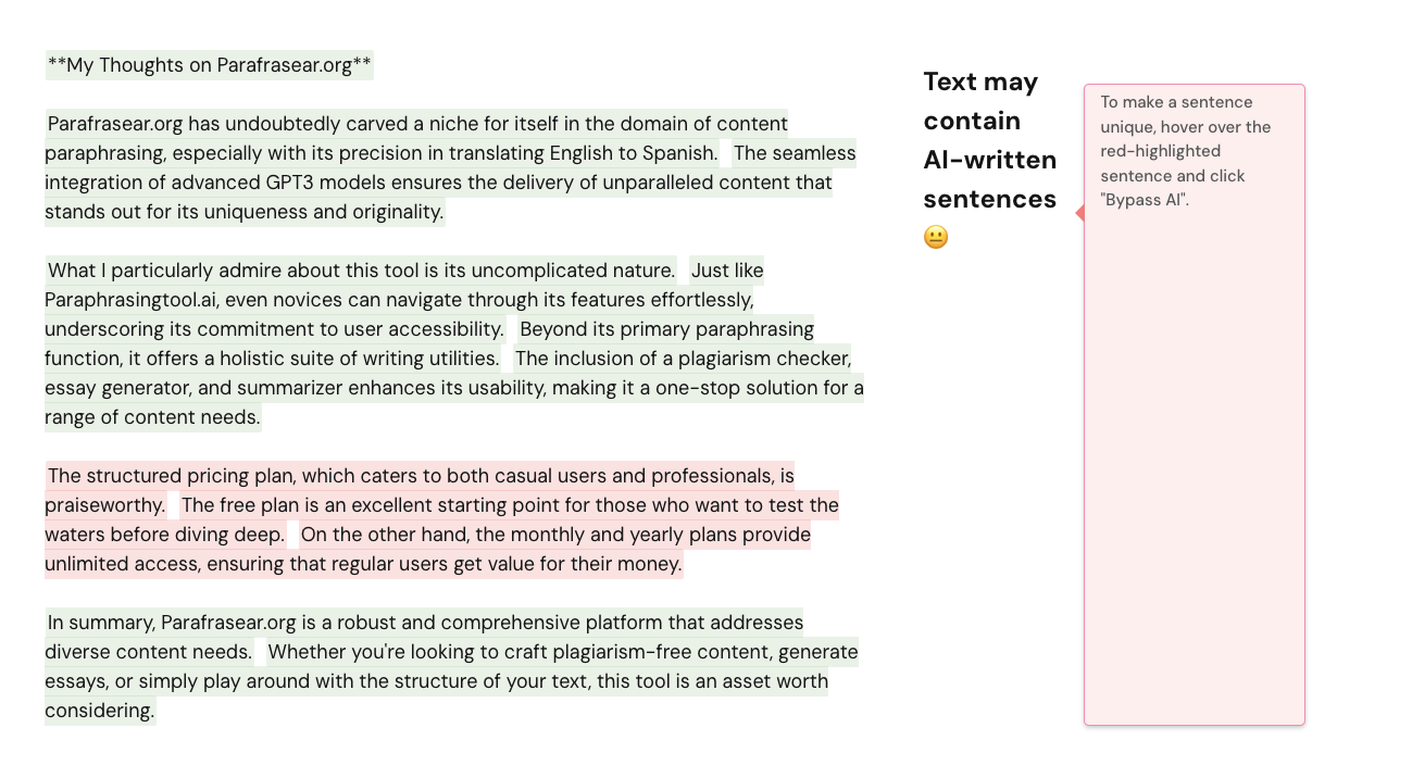 That’s not even all. If the content is AI generated as shown in the screenshot below, there is an option of bypassing that content. You can remove the fragments of AI text by clicking on the Bypass AI.
